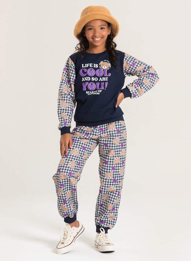 Já a calça, confeccionada em moletom felpado 100% poliéster, conta com estampa sublimada, cós elástico e punho em ribana, também no tom marinho, para um conjunto totalmente coordenado e confortável. Ideal para aquecer com muita atitude!