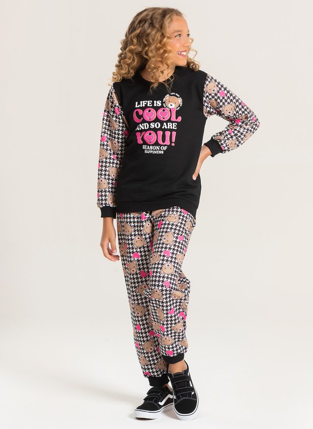 Já a calça, confeccionada em moletom felpado 100% poliéster, conta com estampa sublimada, cós elástico e punho em ribana, também no tom preto, para um conjunto totalmente coordenado e confortável. Ideal para aquecer com muita atitude!