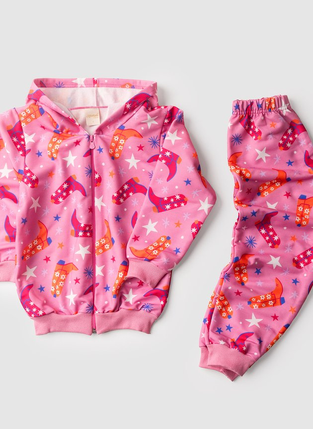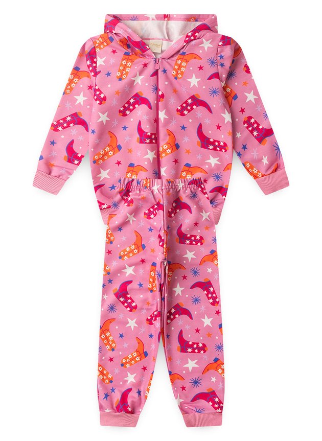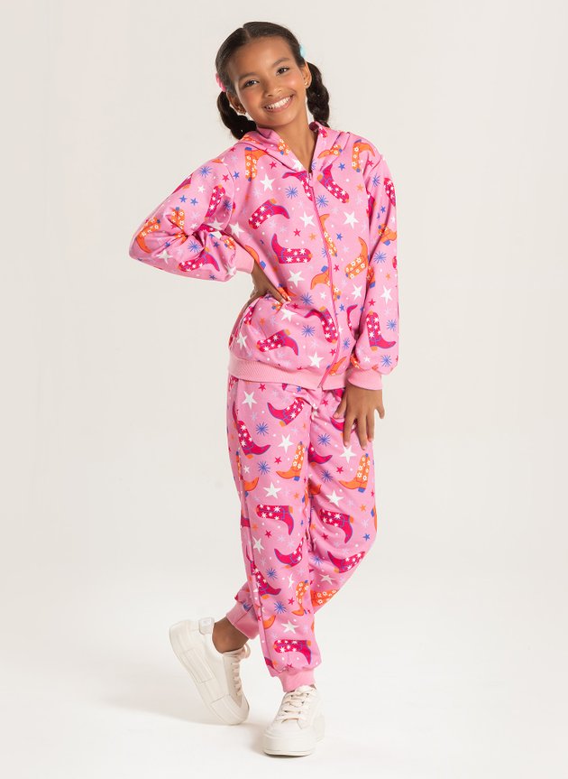 A calça, também em moletom felpado 100% poliéster, conta com estampa sublimada, cós elástico e punhos em ribana, tudo na cor rosa para um visual coordenado e aconchegante. Um look cheio de charme para as aventuras de inverno!