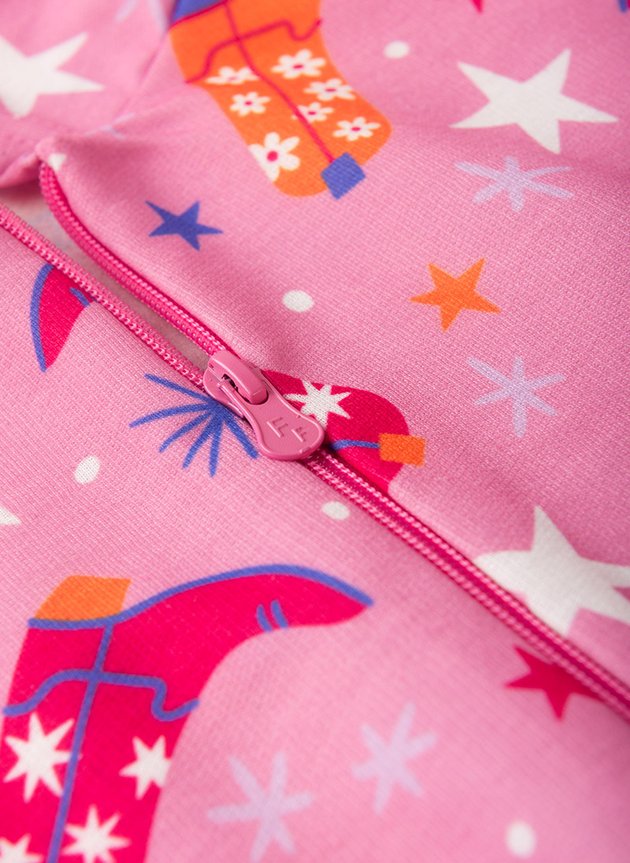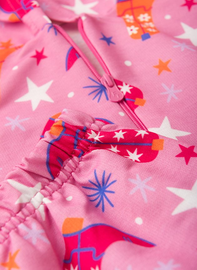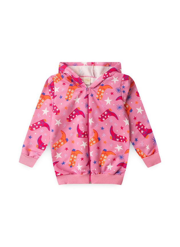 A jaqueta, confeccionada em moletom felpado 100% poliéster, apresenta capuz para maior proteção, fechamento em zíper, além de uma estampa sublimada encantadora de boiadeira que adiciona um toque de diversão. Com punhos e barra em ribana e na cor rosa, ela garante um ajuste perfeito e confortável.