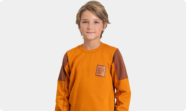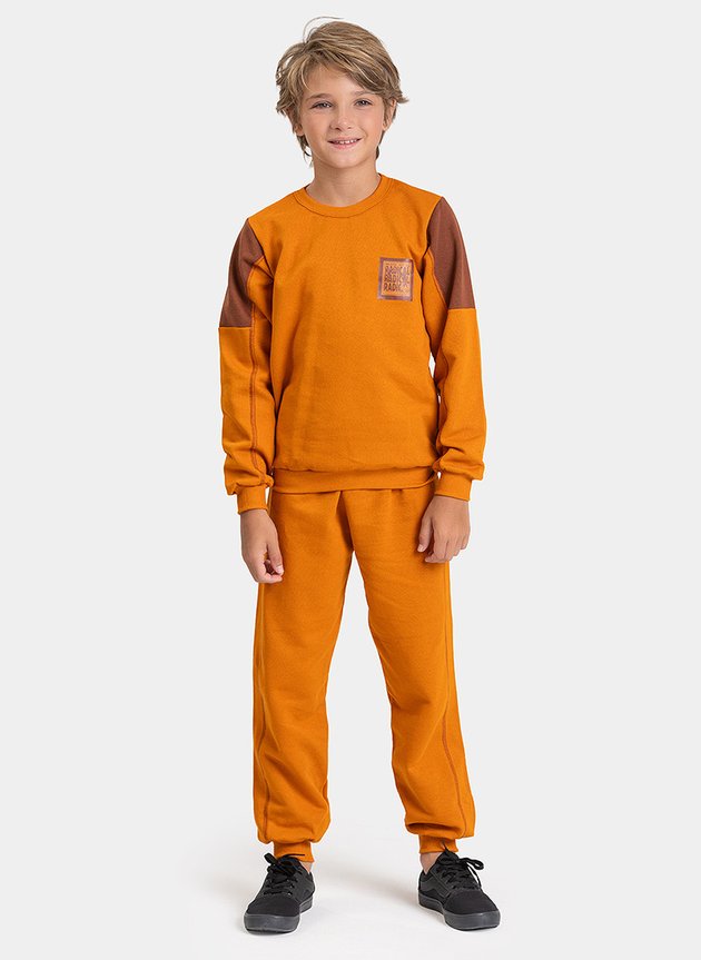A calça, também na cor canela, é confeccionada em moletom sem felpa 100% algodão, oferecendo conforto térmico leve e flexibilidade para acompanhar as brincadeiras. O cós com elástico facilita o vestir e proporciona ajuste seguro, enquanto o detalhe em trançador e os punhos em ribana completam o visual com acabamento moderno e funcional. Um conjunto versátil e cheio de personalidade para os meninos aproveitarem o inverno com conforto e estilo.