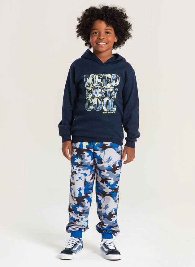 Já a calça, confeccionada em moletom felpado 100% poliéster, apresenta uma estampa sublimada camuflada, cós elástico e punhos em ribana, tudo na cor royal para criar um contraste moderno. Esse conjunto garante liberdade de movimento e um visual repleto de personalidade para o inverno do seu pequeno!