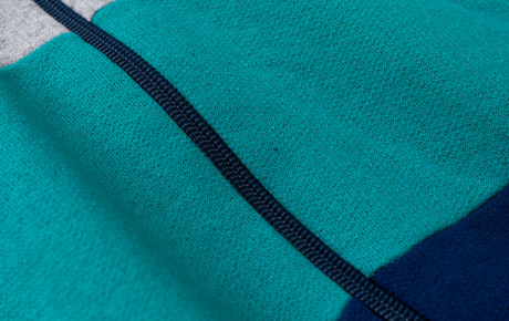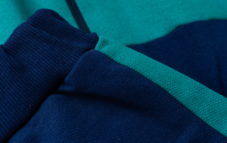 A calça, na cor marinho, é confeccionada em moletom felpado 100% algodão, com recortes laterais na cor verde e filetes em mescla. Conta com cós com elástico que proporciona conforto durante o uso e punhos em ribana, garantindo um caimento impecável.