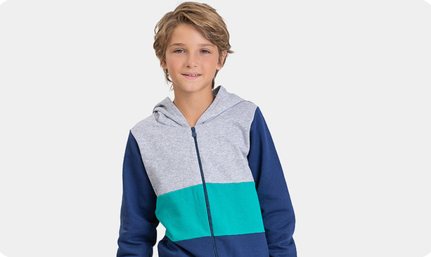 A jaqueta, na cor mescla, possui fechamento em zíper, capuz funcional e recortes modernos nas cores verde e marinho. É confeccionada em moletom felpado 88% algodão e 12% poliéster, com punhos e barra em ribana para um ajuste mais confortável.