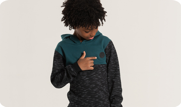 O blusão, confeccionado em moletom com felpa (95% algodão e 5% poliéster), possui capuz, aplique patch "MLK" e detalhes de recortes na cor verde (100% algodão), além de punhos e barra em ribana para um ajuste perfeito.