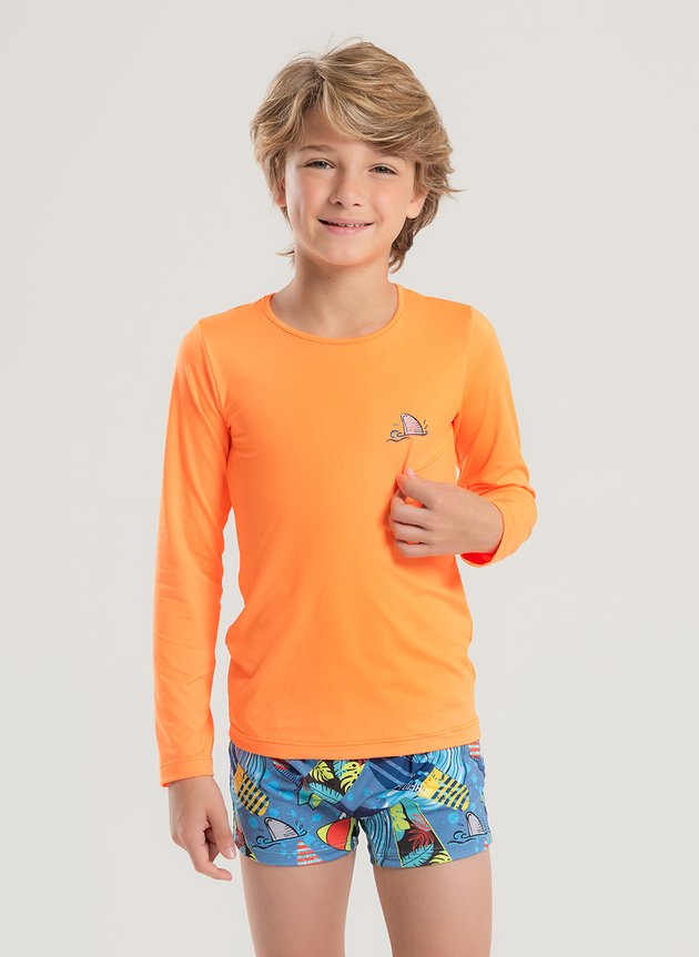 A camiseta de manga longa, na cor laranja, é confeccionada em suplex 96% poliéster e 4% elastano, com estampa lateral que remete ao universo do surf.