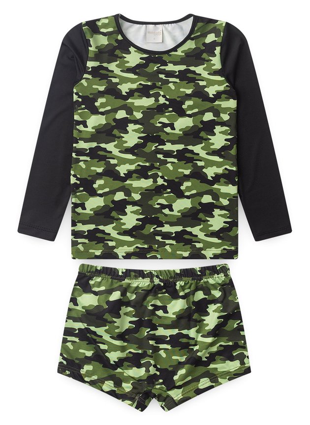 A sunga acompanha na mesma proposta, também em suplex, com estampa sublimada camuflada e cós com elástico, oferecendo ajuste seguro e liberdade para brincar com estilo na praia ou na piscina.