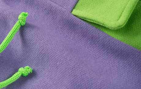 O short, na cor lilás, também em algodão, possui cós rebatido e cadarço para um ajuste seguro, além de um recorte lateral na cor verde, com lapela, completando o conjunto com charme e elegância.