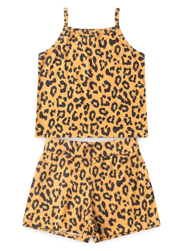 Garanta conforto e qualidade para sua criança com o Conjunto Verão Menina Cropped Alcinha e Shorts Oncinha.