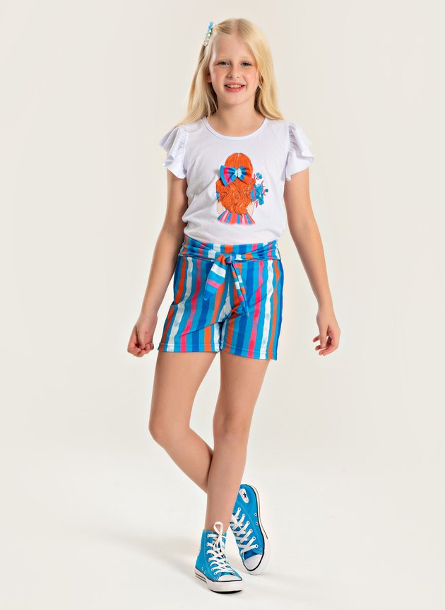 O shorts traz uma estampa listrada colorida em tecido leve (96% poliéster e 4% elastano), garantindo conforto e liberdade para as brincadeiras. O cós elástico junto com a faixa para amarração proporciona ajuste aconchegante e um charme extra no look. Com esse conjunto, qualquer passeio no parque, encontro com a família ou tarde de brincadeira ganha um toque moderno e alegre.