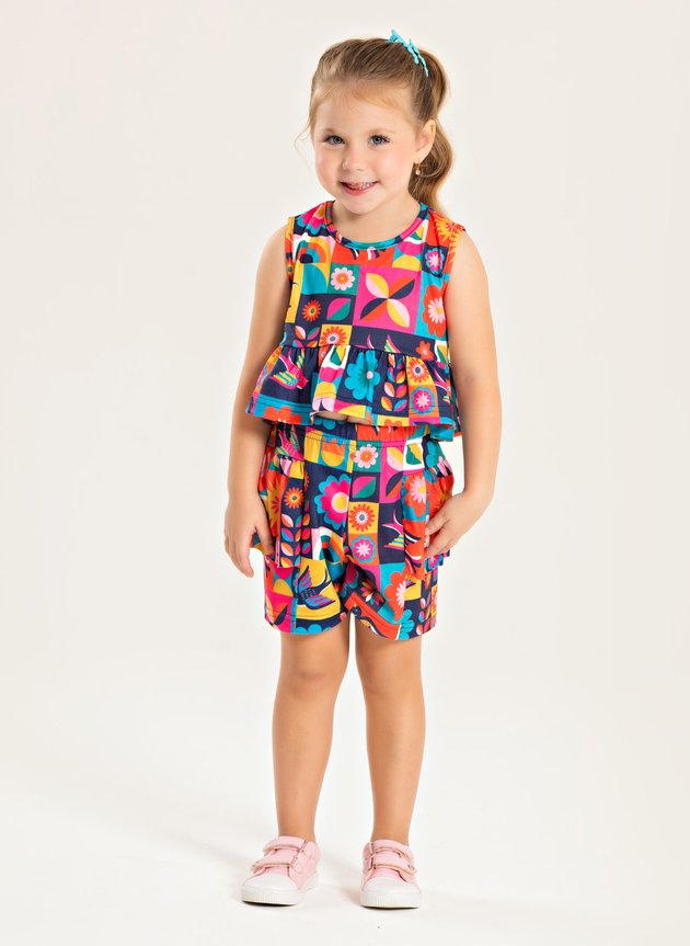 Garanta conforto e qualidade para sua criança com o Conjunto Verão Menina Cropped Regata e Shorts com Babado Mosaico de Flores.