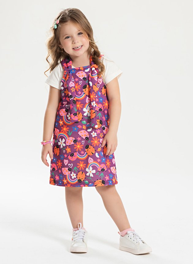 A salopete, em tom roxo, é feita em moletom sem felpa 100% poliéster, com estampa sublimada alegre e delicada de joaninhas, que completa o look com um ar lúdico e encantador. Um conjunto leve e cheio de estilo para as pequenas se divertirem com conforto durante o verão.
