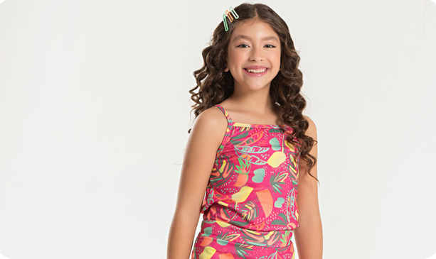 O short, no mesmo tom e tecido, conta com cós com elástico que oferece ajuste confortável e liberdade para brincar. Um conjunto fresquinho, prático e cheio de estilo para as pequenas aproveitarem os dias quentes com muito charme.