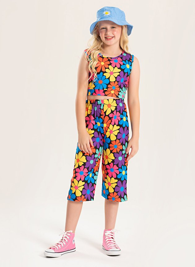 O Conjunto Verão Menina Cropped com Amarração nas Costas e Calça Pantacourt Florido é a escolha ideal para um look moderno, fresquinho e cheio de charme.