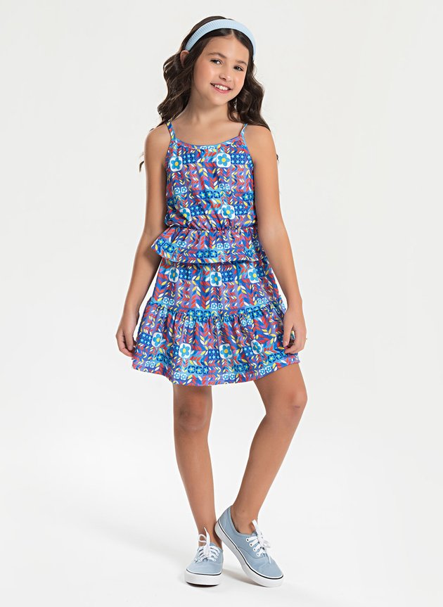 Garanta conforto e qualidade para sua criança com o Conjunto Verão Menina Cropped Alcinha com Babado e Saia Flores da Estação..