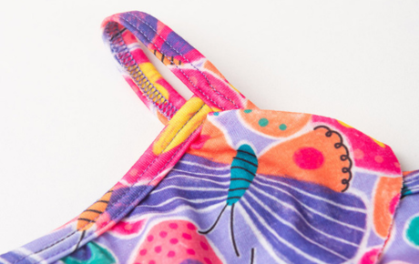 A regata de alcinha, na cor tulipa, é confeccionada em poliplex com 96% poliéster e 4% elastano, conta com estampa sublimada encantadora e babado delicado que traz leveza ao visual.