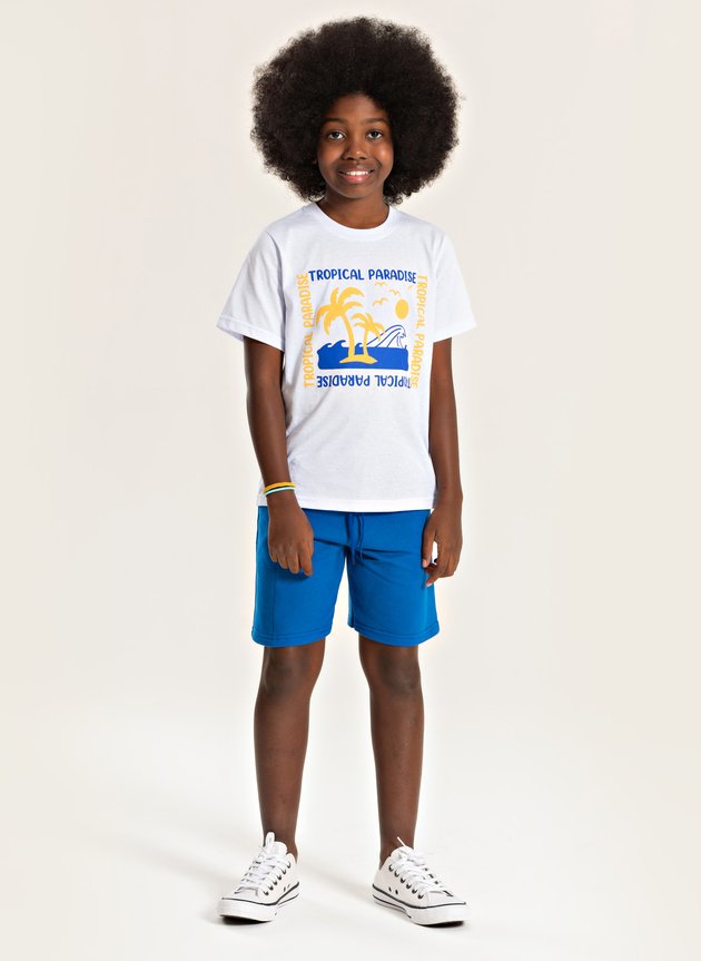 Se você procura versatilidade, conforto e estilo em um só, o conjunto verão menino Tropical Paradise é a escolha ideal para seu pequeno. A camiseta branca, feita em meia malha 100% algodão, conta com uma estampa frontal inspirada em paisagens tropicais, perfeita para combinar com a energia do verão. A gola reforçada garante maior durabilidade, mantendo a peça bonita mesmo após várias lavagens. Além disso, se você quiser conferir outros modelos estilosos para a época mais amada do ano, nossa categoria de Conjuntos Infantis Masculinos oferece várias opções igualmente divertidas.