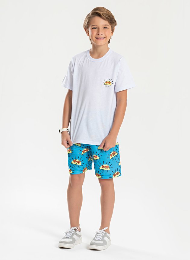 A bermuda, em tom azul, é feita em moletom careca 100% poliéster, com estampa sublimada e cós com elástico que garante ajuste confortável. Um conjunto leve, alegre e perfeito para acompanhar os pequenos nas brincadeiras de verão.