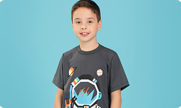 A camiseta, confeccionada em 100% algodão, oferece conforto e leveza, com uma estampa frontal de astronauta que vai encantar os pequenos aventureiros. A cor cinza da camiseta traz um toque vibrante e moderno.