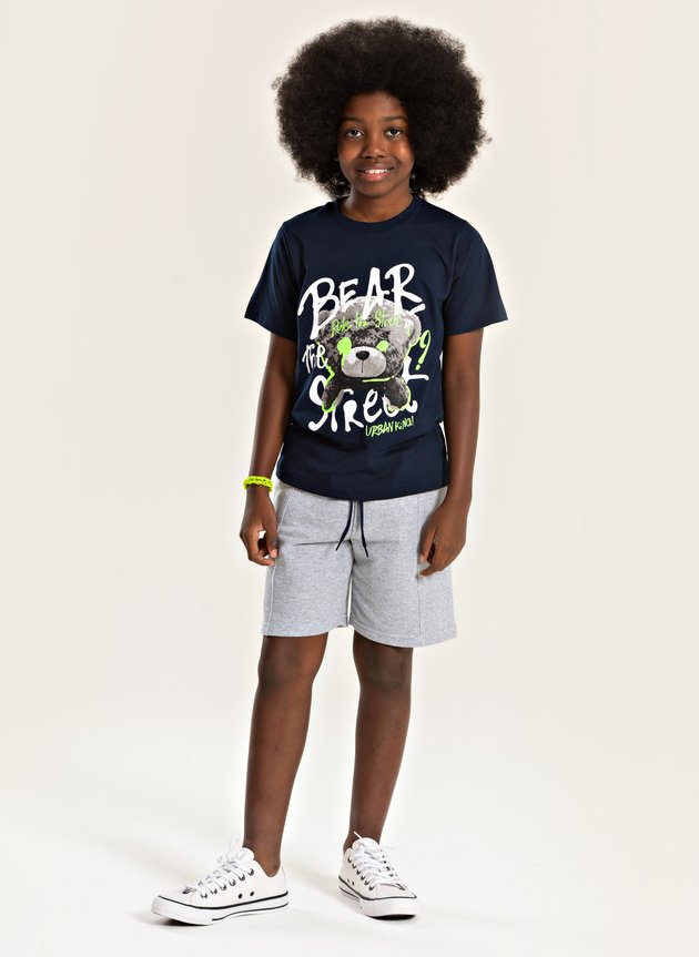 A bermuda, na cor mescla, é feita em moletom careca com 88% algodão e 12% poliéster, conta com cós com elástico e cadarço para ajuste ideal, além de recorte com pesponto que dá um toque moderno ao visual. Um conjunto leve, prático e cheio de atitude para os meninos curtirem o verão com estilo e liberdade.