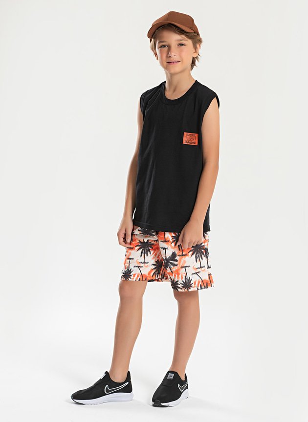 Garanta conforto e qualidade para sua criança com o Conjunto Verão Menino Regata com Aplique e Bermuda Coqueiros.