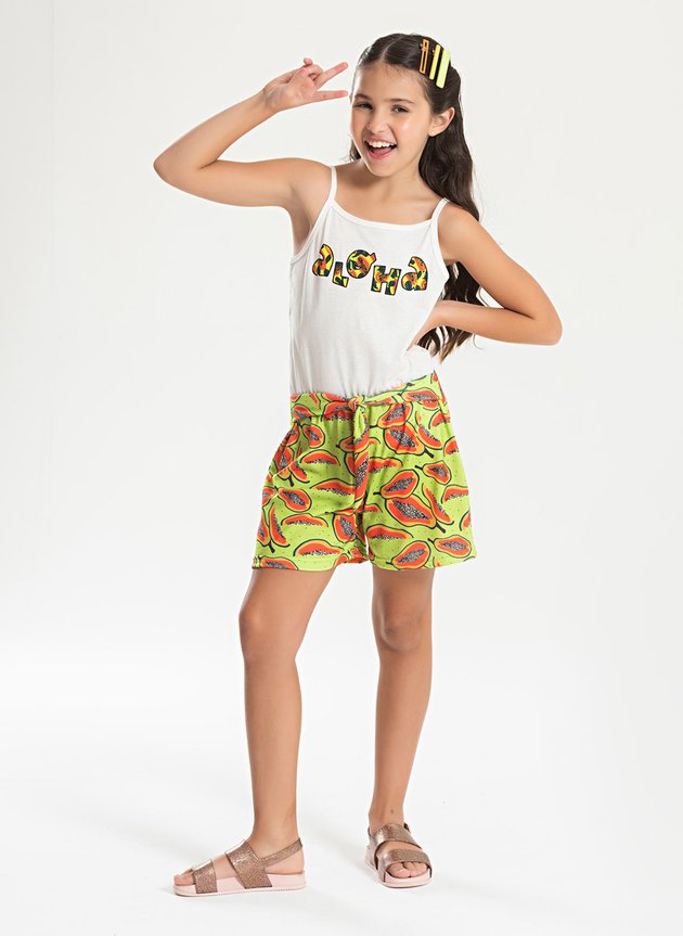 Combinando praticidade e estilo, o modelo traz a parte superior em meia malha 100% algodão, na cor natural, com estampa frontal que remete ao clima tropical. A parte inferior, em poliplex 100% poliéster, vem na cor verde com estampa sublimada e detalhe de amarração frontal que adiciona charme ao visual. Com alcinhas delicadas e modelagem leve, é a peça ideal para os dias quentes, oferecendo liberdade e frescor para as pequenas aproveitarem o verão com muito estilo.