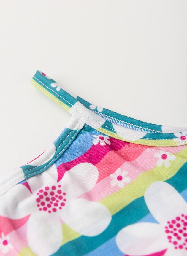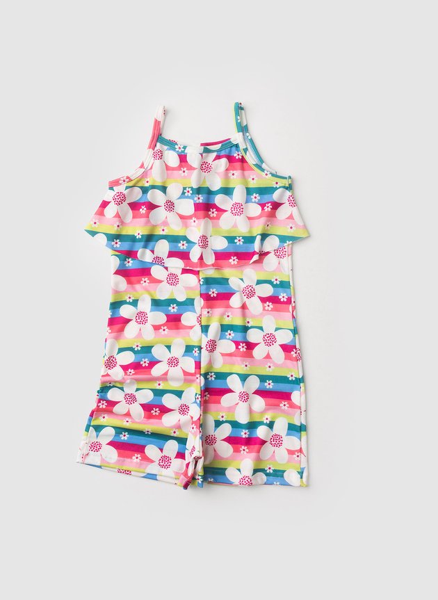 Com visual alegre e cheio de cor, o modelo é confeccionado em poliplex com 96% poliéster e 4% elastano, garantindo um caimento leve e confortável para os dias de calor. Na cor pink, conta com estampa sublimada que mistura flores e listras de forma divertida e estilosa. O babado na parte superior adiciona um toque delicado e feminino à peça, ideal para deixar as pequenas ainda mais encantadoras nas brincadeiras de verão.