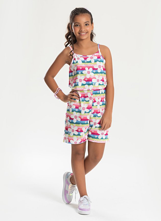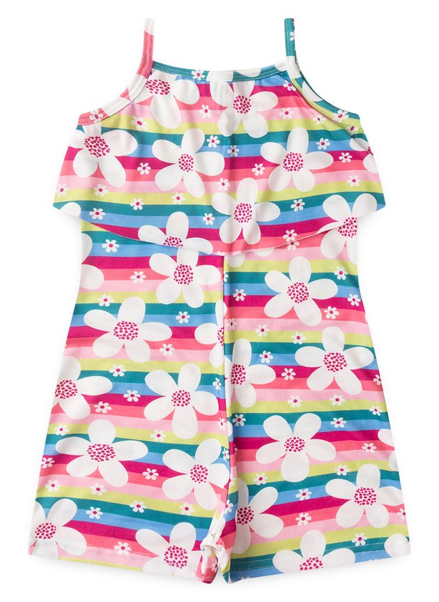 Garanta conforto e qualidade para sua criança com o Macaquinho Verão Menina com Babado Flores e Listras.