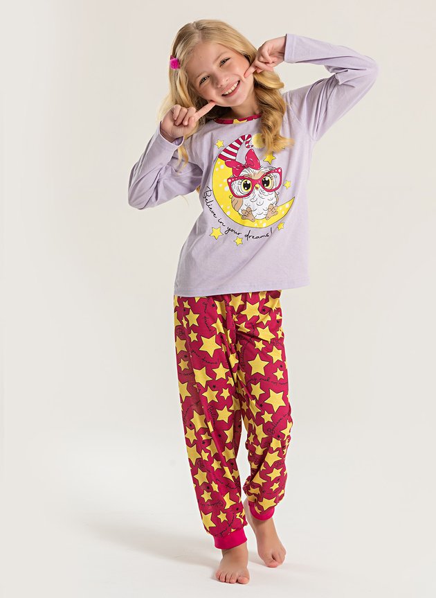 O Pijama Longo Infantil Menina Coruja Estrelar traz um toque mágico para a hora de dormir, garantindo conforto e diversão com um brilho especial!