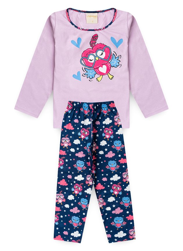A blusa de manga longa, em tom lilás, é confeccionada em meia malha 100% algodão, oferecendo toque suave à pele e excelente respirabilidade. Conta com uma estampa frontal encantadora de coruja com óculos, despertando o imaginário infantil. A gola ganha um charme especial com estampa sublimada combinando com a temática. A calça, em cor marinho, é feita em malha fiada 100% poliéster com estampa sublimada de corujas, cós com elástico que proporciona ajuste confortável e liberdade de movimentos para dormir ou brincar com tranquilidade. Uma peça cheia de personalidade e aconchego.
