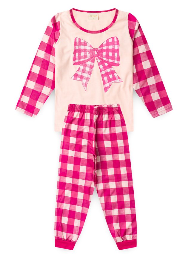 A blusa de manga longa, na cor pérola, é confeccionada em meia malha 100% algodão e apresenta uma delicada estampa frontal de laço, combinando com as mangas que trazem estampa sublimada em xadrez, confeccionadas em malha fiada 100% poliéster. A gola segue o mesmo padrão xadrez, criando uma harmonia visual encantadora. Já a calça, em tom pink, é confeccionada em malha fiada 100% poliéster, com estampa sublimada xadrez, cós com elástico para ajuste confortável, além de punhos que garantem caimento perfeito. Um conjunto quentinho e estiloso para embalar os sonhos das pequenas com muito aconchego.