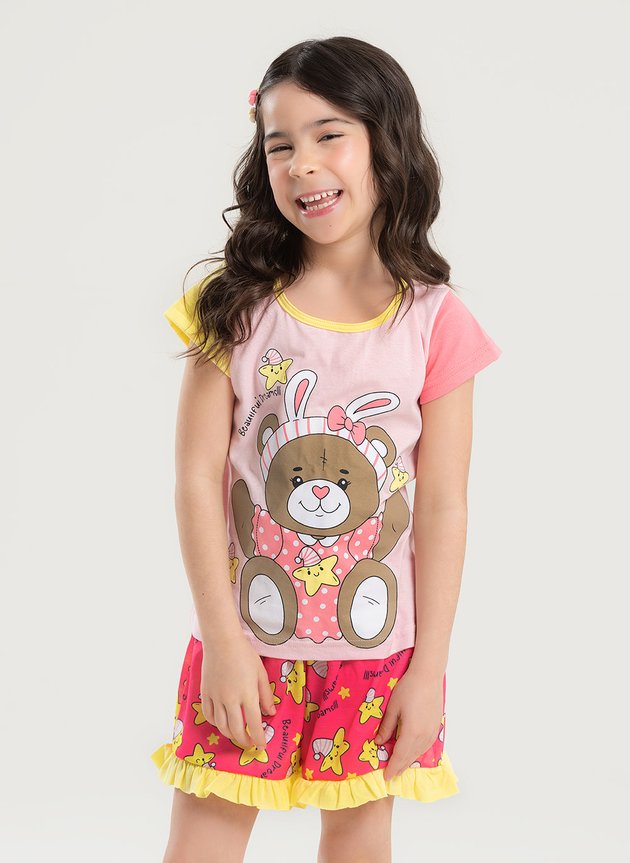 Deixe a hora de dormir mais encantadora com o Pijama Verão Menina Blusa e Shorts Ursinha dos Sonhos!