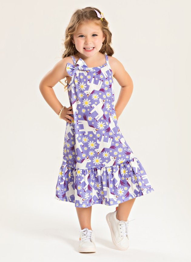 Este vestido na cor roxo, é confeccionado em poliplex com 96% poliéster e 4% elastano, oferecendo leveza, elasticidade e frescor para os dias quentes. Possui estampa sublimada encantadora de unicórnios, alcinhas delicadas com laço costurado e babado na barra, que trazem um toque de charme e movimento ao look. Um vestido lúdico, confortável e cheio de estilo para as pequenas brilharem no verão.
