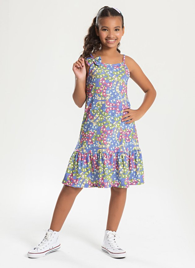 Cheio de charme e delicadeza, o modelo é confeccionado em poliplex com 96% poliéster e 4% elastano, proporcionando leveza e caimento confortável para os dias de calor. Na cor tulipa, o vestido conta com estampa sublimada de lacinhos, babado na barra que dá movimento à peça e lacinho aplicado na alcinha, que completa o visual com um toque gracioso. Ideal para deixar as pequenas fresquinhas e estilosas durante o verão.
