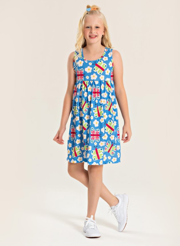 Este vestido na cor azul, é confeccionado em poliplex com 96% poliéster e 4% elastano, oferecendo leveza, frescor e liberdade de movimento para os dias quentes. Com modelagem regata e estampa sublimada de borboletas, o vestido traz um visual encantador, delicado e perfeito para acompanhar as pequenas em momentos de diversão com muito estilo.